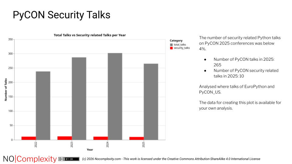 In total, 1,092 talks were reviewed for security-related content. I found only 10 security-related talks delivered in 2025. Consequently, the proportion of security-focused Python talks at PyCon 2025 conferences was below 4%. Given the importance of security awareness for programmers, I consider this a low figure. Since organisations such as the Open Worldwide Application Security Project (OWASP – owasp.org ) Foundation are continuously working to promote secure programming practices, it is clear that more effort is needed.